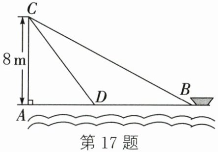 17. 如图,在离水面高度为8m的岸上,有人用绳子拉船靠岸,开始时绳子$BC$的长为17m,几分钟后船到达点$D$的位置,此时绳子$CD$的长为10m,则船向岸边移动了______