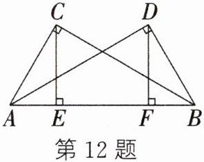 12. 如图,$AC⊥BC$,$AD⊥BD$,$AD= BC$,$CE⊥AB$,$DF⊥AB$,垂足分别是$E$、$F$,$CE= DF$吗?请说明理由。