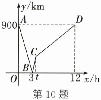 10. 某一列动车从甲地匀速开往乙地,一列普通列车从乙地匀速开往甲地,两车同时出发,设普通列车行驶的时间为$x$(h),两车之间的距离为$y$(km),图中的折线表示$y与x$之间的函数关系.根据图象进行探究,图中$t$的值是______