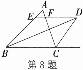 8. 如图,在$\triangle ABC$中,$\angle ABC的平分线与\angle ACB的外角平分线交于点D$,过点$D作EF// BC交AB于E$,交$AC于F$,若$BE= 8$,$CF= 6$,则$EF$的长是(