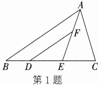 1. 如图,在$\triangle ABC(AB≠AC)$中,$D$、$E在BC$上,且$DE= EC$,过$D作DF// BA$,交$AE于点F$,$AE平分∠BAC$。求证:$DF= AC$。