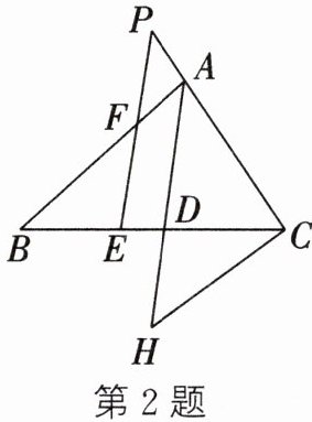 2. 如图,在$\triangle ABC$中,$AD平分∠BAC$,$E是BC$上一点,$BE= CD$,$EF// AD交AB于点F$,交$CA的延长线于点P$,$CH// AB交AD的延长线于点H$。