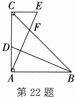 22. 如图,在$\triangle ABC$中,$\angle BAC = 90^{\circ}$,$AB = AC$,$EC\perp AC$,垂足为$C$,$AE交线段BC于F$,$D是AC$边上一点,连接$BD$,且$BD = AE$.
