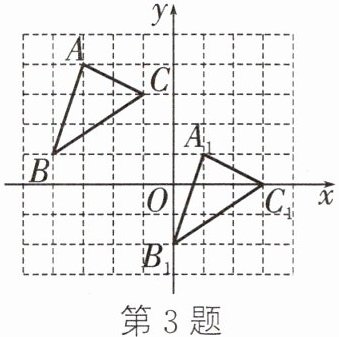 3. 如图,在平面直角坐标系中,$△ABC的顶点坐标分别为A(-3,4),B(-4,1),C(-1,3)$,将$△ABC平移得到△A_{1}B_{1}C_{1}$,顶点$A_{1}的坐标为(1,1)$,则顶点$B_{1}$的坐标为