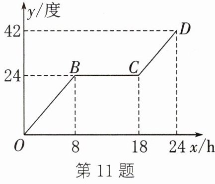 11. 小明家所在地的供电公司实行“峰谷电价”,峰时$(8:00\sim 21:00)$电价为0.5元/度,谷时$(21:00\sim 次日8:00)$电价为0.3元/度.为了解空调制暖的耗能情况,小明记录了家里某天0时~24时内空调制暖的用电量,其用电量y(度)与时间x(h)的函数关系如图所示.