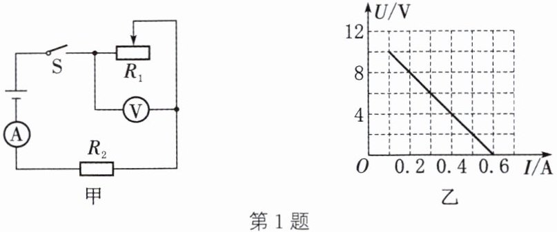 1. 如图甲所示,电源电压保持不变,$R_{2}$是定值电阻。闭合开关,将滑动变阻器$R_{1}$的滑片从最右端滑到最左端,电压表示数$U与电流表示数I$的变化关系如图乙所示,下列说法正确的是 ()