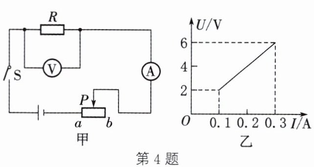 4. 如图甲所示的电路中,电源电压保持不变,闭合开关后,滑片 P 由 b 端滑到 a 端,电压表示数 U 与电流表示数 I 的变化关系如图乙所示,则定值电阻为____Ω,滑动变阻器最大阻值为____Ω,电源电压为____V。