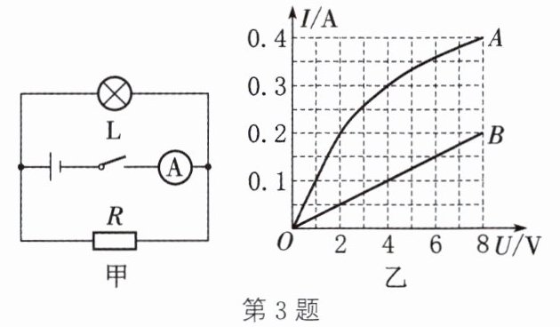 3. 将小灯泡 L 和定值电阻 R 接在如图甲所示的电路中,两者的 I-U 关系图像如图乙所示,其中图线____(A/B)表示电阻 R 的 I-U 关系,电阻 R 的阻值为____Ω;若电源电压为 4 V,则电流表示数为____A;若电流表示数为 0.25 A,则电源电压为____V。
