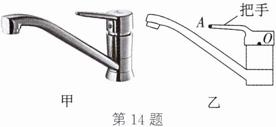 14. (2025·陕西模拟)小明在帮妈妈做饭时观察到厨房的水龙头如图甲所示,用力抬起把手,就可打开水龙头。水龙头的结构示意图如图乙所示,若将把手视为可绕$O$点转动的杠杆,请在图乙中$A点画出打开水龙头的最小动力F$的示意图。