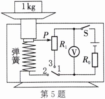 5. (2024·无锡期末)在物理跨学科实践活动课上,小华和同学利用所学的电学知识,设计了电子秤的原理图,如图所示。它利用电压表的示数来表示物体的质量,托盘、轻弹簧上端和金属滑片固定在一起(托盘和弹簧的质量、电阻均不计)。已知电源电压$U= 3V$,电阻$R_{0}= 10Ω$,电阻$R_{1}= 20Ω$,电压表的量程为$0\sim 3V$。
