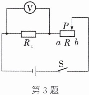 3. 在伏安法测电阻的实验中电流表突然损坏,小组同学经过讨论设计了一种实验方案,也可测出$R_{x}$的阻值。电路如图所示,电源电压未知且恒定不变,$a$、$b$为滑动变阻器左、右两个端点,滑动变阻器最大阻值为$R_{max}$,请你把以下测量步骤补充完整。