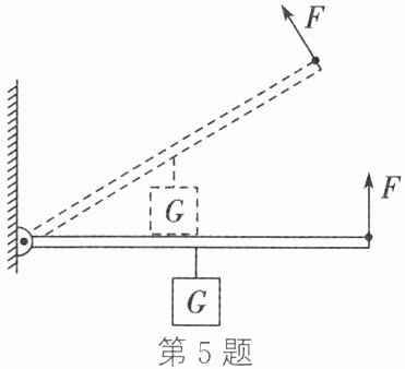 5. 如图所示,在长为$L$的轻质均匀杠杆的中点处悬挂一重物,在杠杆的最右端施加一个始终与杠杆垂直的力$F$,杠杆保持平衡。若不考虑杠杆的自重和阻力,则杠杆从水平位置向上转动过程中,拉力$F$的大小将 ()