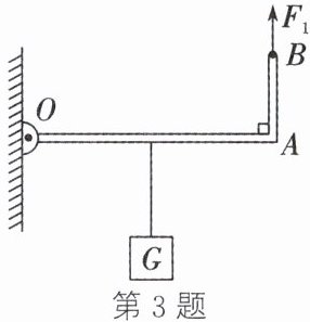 3. 如图所示,$OAB$是杠杆,$OA与BA$垂直,在$OA的中点挂一重为G$的物体,加在$B点的动力F_{1}$由竖直向上的位置沿逆时针方向转到水平向左的位置,动力$F_{1}$的大小变化情况是______(变大/先变大后变小/先变小后变大/变小)。