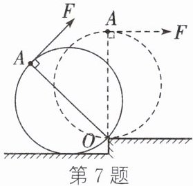 7. 如图所示,质地均匀的圆柱在拉力$F$的作用下由实线所示位置匀速转到虚线所示位置,整个过程中,拉力$F始终作用于A点且与OA$保持垂直($OA$为圆柱横截面的一条直径),圆柱在转动过程中不打滑。下列分析正确的是 ()
