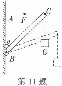 11. 如图所示,轻质细杆$BC可绕竖直墙上的B$点转动,末端$C$点挂一重物,重力为$200N$,拉力$F$始终沿水平方向,此时$\theta =45^{\circ}$,则拉力$F= $______$N$,若拉力保持水平方向,让细杆顺时针缓慢旋转一个小角度到虚线位置,则拉力将______(变大/不变/变小)。