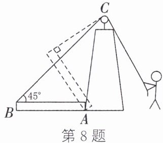 8. 如图所示,士兵用力缓慢匀速拉动绳子,在杠杆$AB$缓慢匀速升至虚线位置的过程,士兵所施加的力的大小变化是 ()