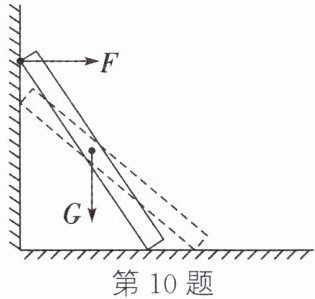 10. 一根粗细均匀的木棒斜靠在竖直墙壁上,墙壁光滑,地面粗糙,木棒受到的重力为$G$,墙壁对木棒的弹力为$F$,如图所示。现让木棒的倾斜程度变小一些至虚线所示位置,木棒仍能静止斜靠在墙上。与原来相比,$F$的变化情况为______(变大/不变/变小)。