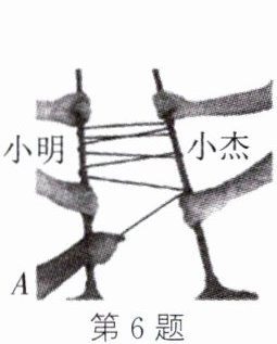 6. (教材P14练习T2变式)小明和小杰握住两根较光滑的木棍,小华将绳子的一端系在其中一根木棍上,然后按如图所示依次将绳子绕过两根木棍,小明和小杰相距一定的距离握紧木棍站稳后,小华在图中A处拉绳子的另一端,用很小的力便能拉动他们。