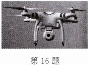 16. 如图所示为四旋翼无人机,质量为1.2kg,下方悬挂着一个质量为0.1kg的摄像机。在10s内无人机从地面竖直上升了20m,然后边摄像边斜向上飞行了30s,仪表盘上显示离地高度为36m。无人机前10s对摄像机做的功为______J,整个过程中,无人机对摄像机做功的功率为______W。(g取10N/kg)