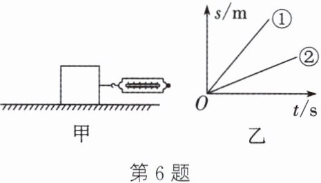 6. 如图甲所示,木块放在水平面上,用弹簧测力计沿水平方向拉木块使其做直线运动,两次拉动木块得到的s-t图线分别是图乙中的①和②。两次对应的弹簧测力计示数分别为$F_{1}$、$F_{2}$,两次拉力的功率分别为$P_{1}$、$P_{2}$,则$F_{1}$______$F_{2}$,$P_{1}$______$P_{2}$。(>/= /<)