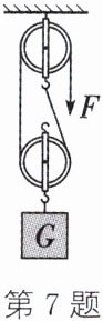 7. 如图所示,用滑轮组匀速提起一个重为350N的物体,物体在5s内竖直上升了2m,人拉绳的力为250N(不计绳重及摩擦)。则: