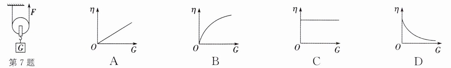7. 如图所示,用手沿竖直方向匀速拉一个动滑轮,使挂在下面重为 $ G $ 的物体缓慢上升,动滑轮的重力不可忽略,现改变物体的重力 $ G $,不计绳重与摩擦,则动滑轮的机械效率 $ \eta $ 与物体重力 $ G $ 的关系图像可能是下列选项中的 ()