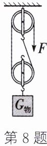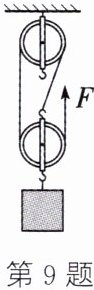9. 用如图所示滑轮组提升物体。某人用100N的拉力 $ F $,30s内使重为180N的物体匀速上升了6m。不计绳重和摩擦。
