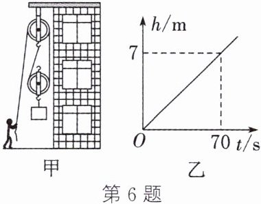 6. 某工人用如图甲所示的滑轮组将400N的物体匀速提升7m,拉力$F= 250N$,物体上升的高度h与所用时间t的关系图像如图乙所示。已知工人的质量为50kg,不计绳重和摩擦,g取10N/kg。试求: