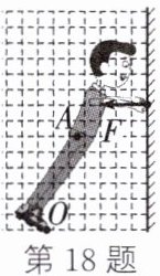 18. 某同学锻炼时,双脚并拢,脚尖 O 触地,脚后跟踮起,手掌支撑在竖直墙壁上,手臂水平,A 为人体重心所在位置。此时墙壁对手掌的支撑力 F 如图,g 取 10 N/kg,不计墙壁对手掌的摩擦力。