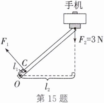 15. 如图是使用手机和自拍杆自拍时的示意图,自拍杆可以看作一个______(省力/费力)杠杆(O 为支点),已知自拍杆长为 1 m(质量忽略不计),手机对杆竖直向下的作用力 $ F_{2} $ = 3 N,图中 $ l_{1} $ = 10 cm、$ l_{2} $ = 80 cm,则手垂直于杆的动力 $ F_{1} $ = ______N,拍摄需要伸长自拍杆时,若保持 $ F_{1} $ 的作用点、方向及支点位置不变,则 $ F_{1} $ 大小将______。