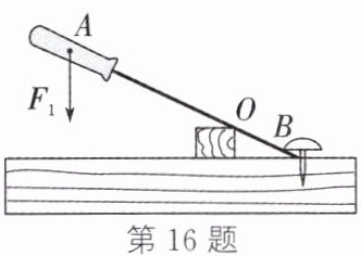 16. (教材 P3 材料改编)如图所示为用螺丝刀撬图钉的示意图,在图中画出动力 $ F_{1} $ 的力臂 $ l_{1} $ 和阻力 $ F_{2} $ 的示意图。