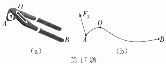 17. (2024·宿迁期末)图(a)是一款水管扳手钳,其中 AOB 部分可视为一个杠杆,其简化示意图如图(b)所示。请在图(b)中画出杠杆平衡时的阻力臂 $ l_{2} $ 及作用在 B 点的最小动力 $ F_{1} $。
