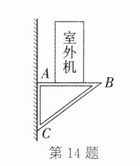 14. 如图所示,用固定在墙上的三角支架 ABC 放置空调室外机。若 A 处的螺钉松脱,则支架会绕______点倾翻。已知 AB 长为 40 cm,AC 长为 30 cm。室外机的重力为 300 N,正好处在 AB 中点处,则 A 处螺钉的水平拉力为______N(支架重力不计)。为了安全,室外机的位置应尽量______(靠近/远离)墙壁。