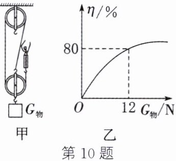 10. 现用如图甲所示的装置来探究滑轮组的机械效率η与所挂物重$G_{物}$的关系,改变$G_{物}$,竖直向上匀速拉动弹簧测力计,计算并绘出η与$G_{物}$关系如图乙所示,若不计绳重和摩擦,则动滑轮自重为______N;图乙中曲线表明,同一滑轮组的机械效率η随所挂物重$G_{物}$的增大而增大,最终______(会/不会)达到100%;仅改变图甲中的绕绳方式、重复上述实验,所得到的$η-G_{物}$图线与图乙所示曲线______(相同/不同)。