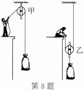 8. 如图所示,小明分别用甲、乙两个滑轮把同一袋沙子从地面提到二楼,用甲滑轮时所用的拉力为$F_{1}$,做的总功为$W_{1}$,机械效率为$η_{1}$;用乙滑轮时所用的拉力为$F_{2}$,所做的总功为$W_{2}$,机械效率为$η_{2}$。若不计绳重与摩擦,则 ()