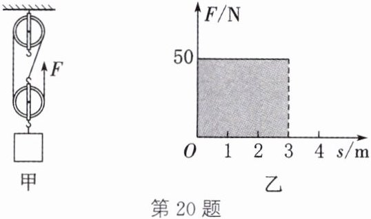 20. 如图甲所示,滑轮组在竖直向上的拉力F作用下,将重为105N的物体匀速提起,在5s时间内绳子自由端移动的距离$s= 3m$,图乙是滑轮组工作时的拉力F与绳子自由端移动距离s的关系图。