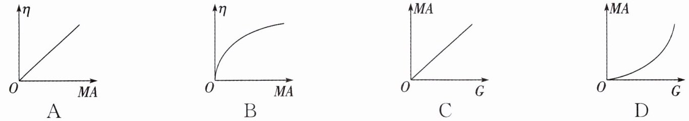 (4) 物理学中把机械对重物施加的力与人对机械施加的力的比值叫作机械效益$ MA $,用于比较不同机械的省力程度。现用如图所示滑轮组匀速提升重物,不计绳重和摩擦。则下列描述滑轮组的机械效率$ \eta 与机械效益 MA $、机械效益$ MA 与重物重力 G $的关系图线中,可能正确的是______。