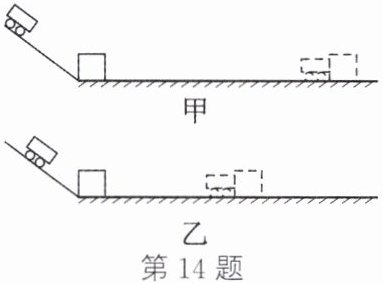 14. 如图所示,在探究物体动能的大小与哪些因素有关时,让同一小车分别从同一斜面的不同高度由静止释放,撞击水平面上同一木块。