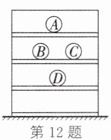 12. 如图所示,货架上放着A、B、C、D四个体积相同的实心球,其中A和B为铅球,C和D为铁球,那么A和B两球相比较,______球的重力势能大;B和C两球相比较,做功本领更大的是______球。($ρ_{铅}>ρ_{铁}$)