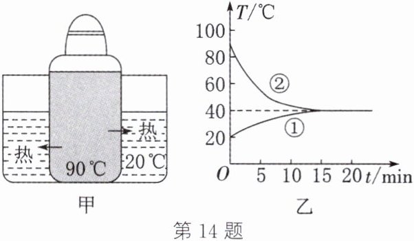 14. (跨学科实践·日常生活)图甲是小明将装有热奶的奶瓶放入室温的水中,水温约为$20^{\circ}C$,热奶的温度约为$90^{\circ}C$,同时,他还利用温度计和钟表测出温度的变化情况,并作出了水和热奶的温度随时间变化的关系曲线,如图乙所示。其中曲线______表示热奶的温度随时间的变化情况,大约经过$15min$热奶和水的温度刚好达到一致。从图像分析可以看出,热奶温度随时间的变化特点是随时间的变化,热奶温度是先快后慢地降低。