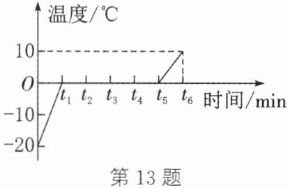 13. 如图所示为某晶体熔化时温度随时间变化的图像,根据图像可以判断:该晶体在$t_{2}$时刻的内能______(大于/等于/小于)$t_{3}$时刻的内能,理由是______。