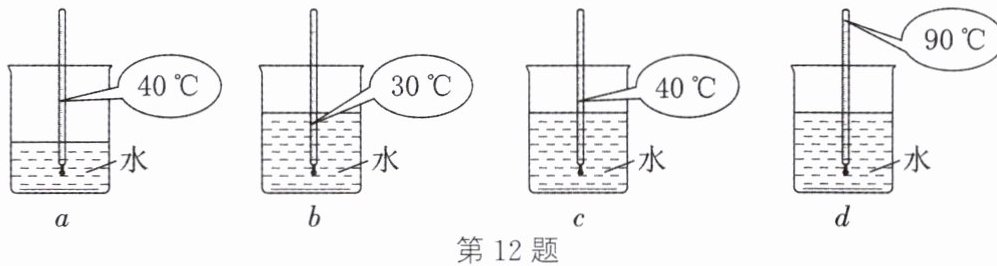 12. 如图所示,$a$杯中水量较少,$b$、$c$、$d$杯中水量相同,根据内能的知识,分析比较各杯中水的内能大小。