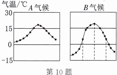 10. 同学们通过地理课的学习知道,温带海洋性气候大多分布在沿海地区,而温带大陆性气候大多分布在内陆地区。如图所示为两气候地区的全年温度变化曲线,从物理的角度分析,下列说法正确的是 ()