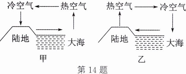 14. 2024年的暑假,瑶瑶同学和家人去海边度假。海边吹的陆风(陆地吹向海洋)和海风(海洋吹向陆地)统称海陆风,海陆风是由于地面和大海升温和降温的快慢不同,从而使空气对流形成的。如图所示是海陆风形成的示意图,其中图______反映晚上海陆风的形成。