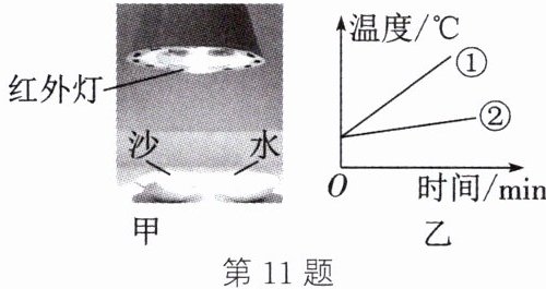 11. 如图所示为“观察不同物质吸热升温现象”的装置。将初温相同,质量均为50g的沙子和水分别放在两个瓷盘中,用红外灯均匀照射两个瓷盘4min后,再用温度计分别测出沙子和水的温度。此时沙子的温度为$55.4^{\circ }C$,水的温度为$30.7^{\circ }C$,下列有关该实验的说法正确的是 ()