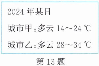 13. 如图所示是2024年某日沿海城市上海和内陆城市兰州两地的气温情况,请根据两个地方的气温变化情况判断城市______(甲/乙)是上海,你的判断依据是______。