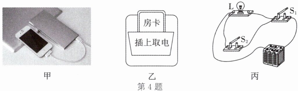 4. 如图甲所示,一个充电宝正在给手机的电池充电,此时充电宝相当于电路中的______,手机的电池相当于______;如图乙所示为宾馆房间的取电房卡,将房卡插入槽中,房间内的用电器才能使用,房卡的作用相当于电路元件中的______;如图丙所示,当开关 $ S_1 $、$ S_2 $ 断开时,电路处于______状态;当开关 $ S_1 $ 闭合、$ S_2 $ 断开时,电路处于______状态;当开关 $ S_1 $、$ S_2 $ 都闭合时,电路处于______状态。
