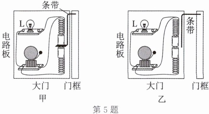 5. (跨学科实践·日常生活)在综合实践活动中,科技小组自制如图甲所示的开门报警器,电路板固定于大门,绝缘条带左端插在两电池之间,右端固定于门框。如图乙所示,大门一旦被打开,灯亮、电铃响,绝缘条带在电路中起到了电路元件______的作用,干电池供电时,把______能转化为电能。某次测试时发现,把大门打开时,灯亮而铃不响,故障可能是电铃处发生______。