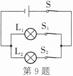 9. 如图所示的电路叫______电路,图中开关$S_{1}$用来控制______,开关$S_{2}$用来控制______,而开关$S$接在______路中,它可以控制______,请在图中用箭头标出电路中的电流方向。