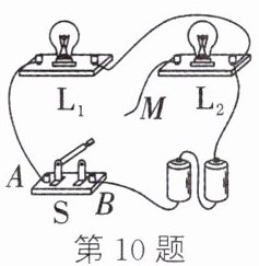 10. 如图所示,某同学要连接由$L_{1}和L_{2}$组成的并联电路。若开关$S$要同时控制两盏灯,则应将导线$M$端接到图中的______点;若开关$S只控制L_{1}$,则导线的$M$端应该接到图中的______点。($A/B$)